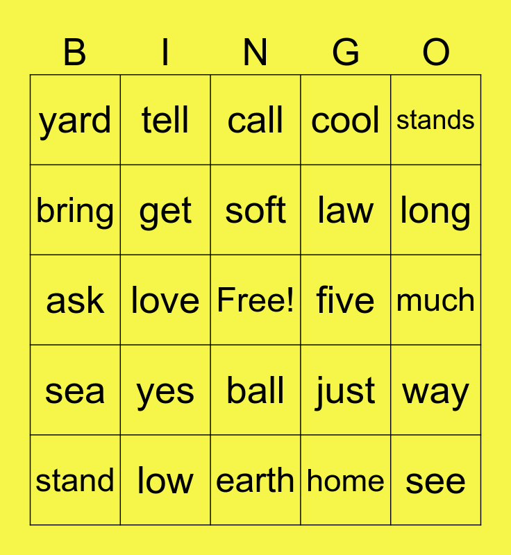 This bingo card has a free space and 24 words: yes, low, soft, stand, stands, yard, bring, tell, five, ball, law, ask, just, way, get, home, much, call, long, love, see, sea, cool and earth.