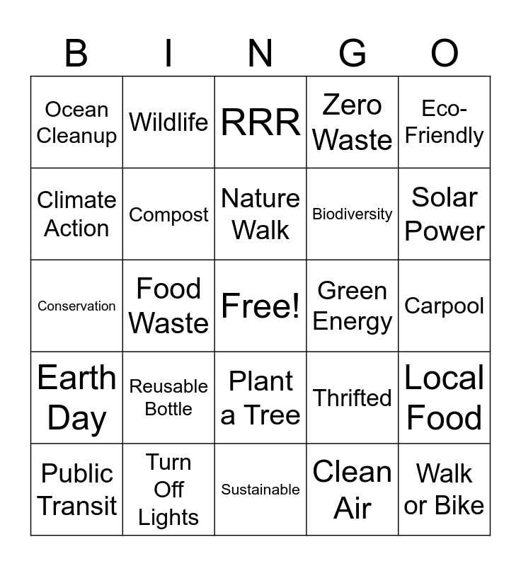 This bingo card has a free space and 29 words: Public Transit, Upcycle, Food Waste, Electric Vehicle, Ocean Cleanup, RRR, Compost, Reusable Bottle, Green Energy, Turn Off Lights, Carpool, Walk or Bike, Sustainable, Clean Air, Solar Power, Recycle Bin, Plant a Tree, Earth Day, Eco-Friendly, Conservation, Thrifted, Green Space, Biodiversity, Climate Action, Zero Waste, Wildlife, Local Food, Nature Walk and Pollinator Garden.