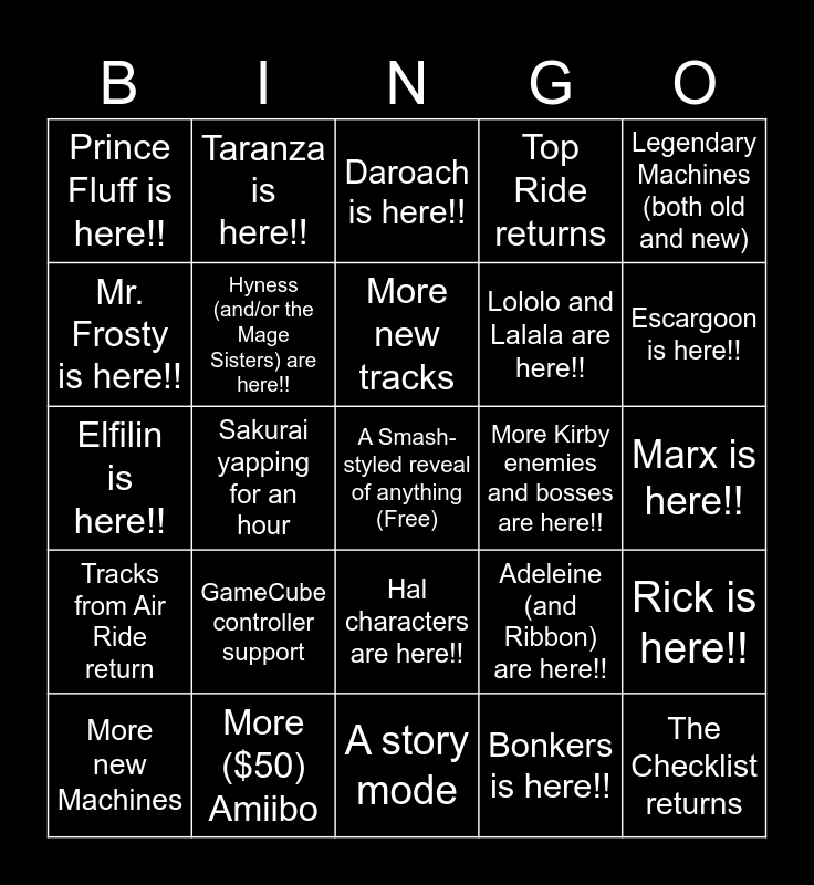 This bingo card has a free space and 24 words: GameCube controller support, More ($50) Amiibo, More new tracks, More new Machines, Legendary Machines (both old and new), Prince Fluff is here!!, Mr. Frosty is here!!, Taranza is here!!, More Kirby enemies and bosses are here!!, Hal characters are here!!, Lololo and Lalala are here!!, Elfilin is here!!, Adeleine (and Ribbon) are here!!, Rick is here!!, Hyness (and/or the Mage Sisters) are here!!, Bonkers is here!!, Marx is here!!, Daroach is here!!, Escargoon is here!!, Sakurai yapping for an hour, The Checklist returns, Tracks from Air Ride return, Top Ride returns and A story mode.
