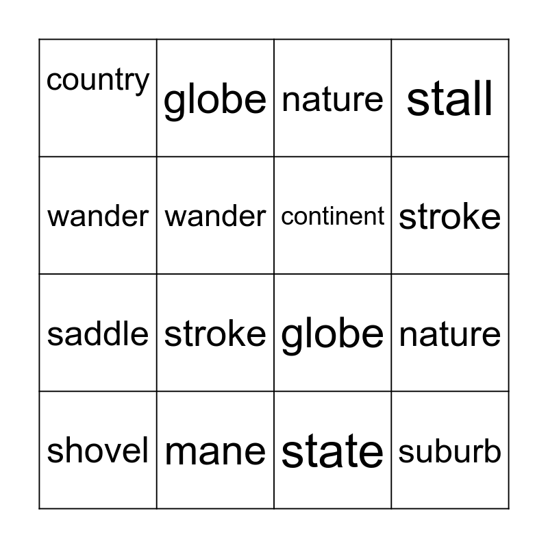 This bingo card has 16 words: mane, nature, nature, country, saddle, globe, globe, state, wander, wander, shovel, stall, stroke, stroke, continent and suburb.