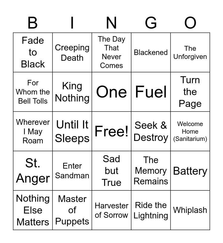This bingo card has a free space and 24 words: Enter Sandman, Master of Puppets, One, Nothing Else Matters, The Unforgiven, Fade to Black, For Whom the Bell Tolls, Creeping Death, Seek & Destroy, Sad but True, Fuel, Wherever I May Roam, The Memory Remains, Battery, King Nothing, Ride the Lightning, Welcome Home (Sanitarium), The Day That Never Comes, Turn the Page, Until It Sleeps, Whiplash, St. Anger, Blackened and Harvester of Sorrow.