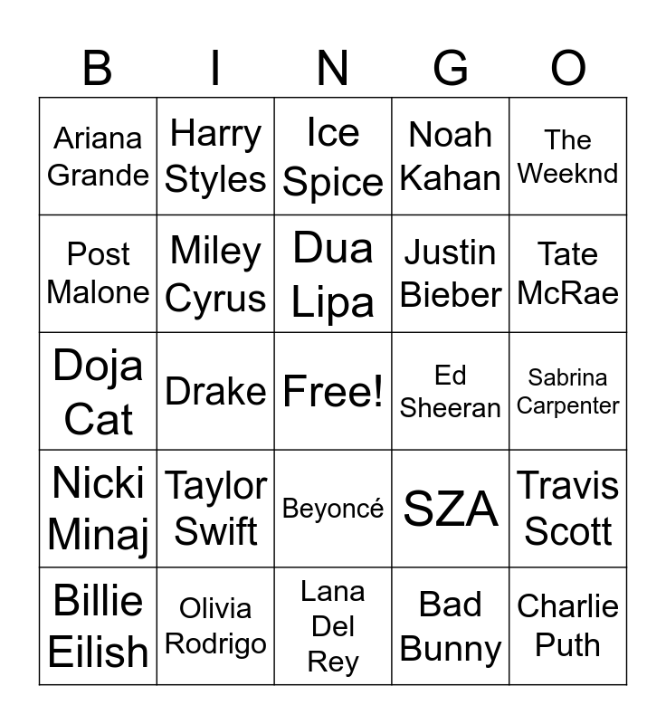 This bingo card has a free space and 24 words: Taylor Swift, Olivia Rodrigo, Dua Lipa, Billie Eilish, The Weeknd, Ariana Grande, Post Malone, Harry Styles, Ed Sheeran, Beyoncé, Justin Bieber, Doja Cat, SZA, Travis Scott, Miley Cyrus, Bad Bunny, Sabrina Carpenter, Ice Spice, Tate McRae, Drake, Charlie Puth, Nicki Minaj, Noah Kahan and Lana Del Rey.