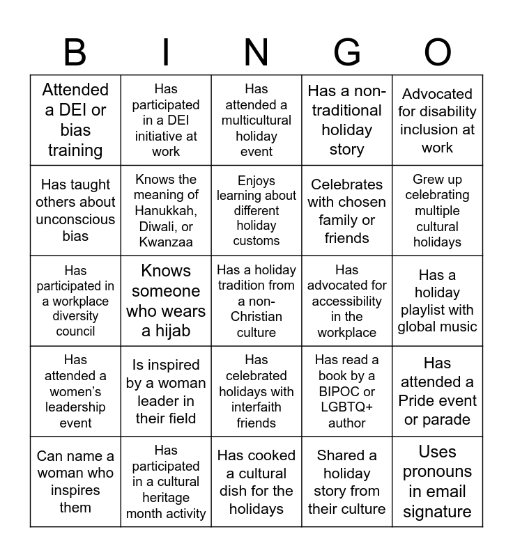 This bingo card has 51 words: Free!, Has a holiday tradition from a non-Christian culture, Is part of the LGBTQ+ community or an ally, Has cooked a cultural dish for the holidays, Is inspired by a woman leader in their field, Speaks more than one language, Has participated in a DEI initiative at work, Wears cultural attire during holiday celebrations, Has taught others about unconscious bias, Celebrates a holiday other than Christmas, Knows the meaning of Hanukkah, Diwali, or Kwanzaa, Has a non-traditional holiday story, Has attended a Pride event or parade, Has read a book by a BIPOC or LGBTQ+ author, Shares music from their culture during holidays, Has traveled to a country for a cultural celebration, Enjoys learning about different holiday customs, Has advocated for accessibility in the workplace, Decorates with symbols from multiple cultures, Advocated for disability inclusion at work, Knows someone who wears a hijab, Shared a holiday story from their culture, Attended a DEI or bias training, Celebrates with chosen family or friends, Supports equity in hiring or promotions, Uses pronouns in email signature, Grew up celebrating multiple cultural holidays, Has volunteered with a community advocacy group, Can name a woman who inspires them, Has attended a multicultural holiday event, Knows how to say “Happy Holidays” in another language, Has supported a minority-owned business this year, Celebrates Lunar New Year or Ramadan, Has shared pronouns in a meeting or event, Has a holiday tradition unique to their family, Has participated in a cultural heritage month activity, Has worked on a pro bono project, Has a friend or colleague from a different faith, Has learned about a new culture this year, Has helped make their workplace more inclusive, Has a holiday playlist with global music, Has attended a women’s leadership event, Has supported LGBTQ+ rights publicly or privately, Has created inclusive holiday decorations, Has a holiday tradition involving storytelling, Has celebrated a holiday virtually with distant family, Has participated in a workplace diversity council, Has shared a recipe from their heritage, Has learned about intersectionality in DEI work, Has celebrated holidays with interfaith friends and Has helped organize an inclusive office event.