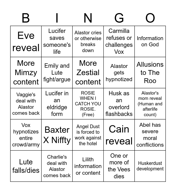 This bingo card has a free space and 24 words: Baxter X Niffty, Charlie's deal with Alastor comes back, More Zestial content, Lute falls/dies, Information on God, Eve reveal, More Mimzy content, Lucifer saves someone's life, Husk as an overlord flashbacks, Angel Dust is forced to work against the hotel, Alastor gets hypnotized, Vaggie's deal with Alastor comes back, Cain reveal, Abel has severe moral conflictions, Emily and Lute fight/argue, One or more of the Vees dies, Alastor's mom reveal (Human and afterlife count), Alastor cries or otherwise breaks down, Allusions to The Roo, Lucifer in an eldridge form, Huskerdust development, Vox hypnotizes entire crowd/army, Carmilla refuses or challenges Vox and Lilith information or content.