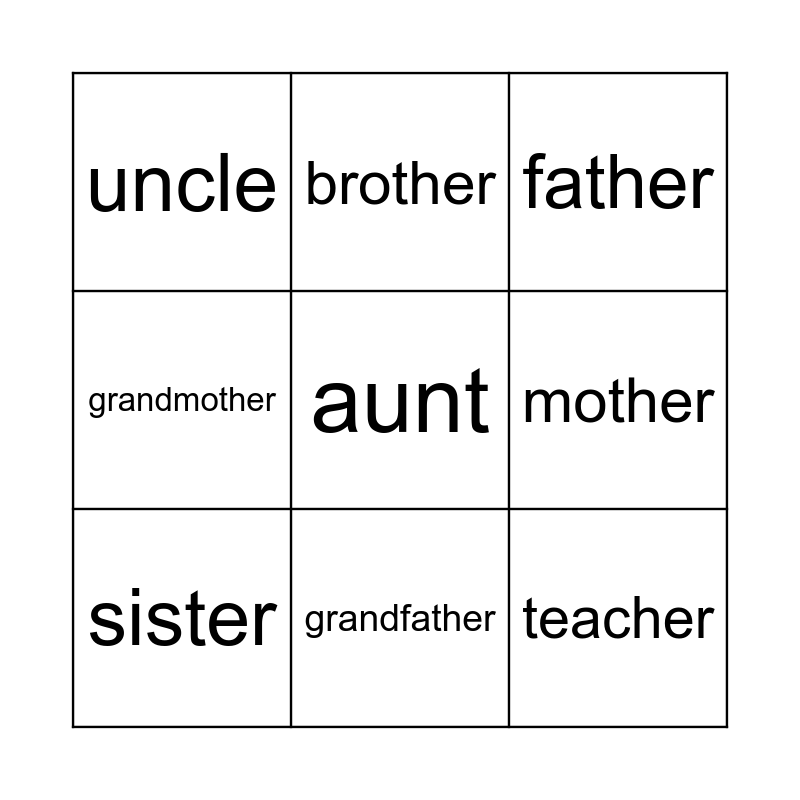 This bingo card has a free space and 8 words: mother, father, brother, sister, uncle, teacher, grandmother and grandfather.