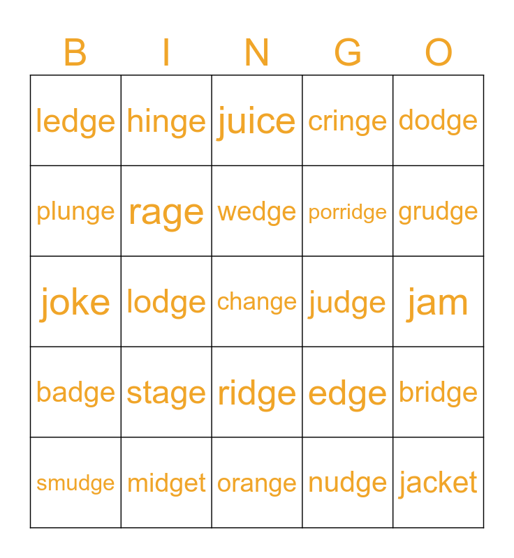 This bingo card has 46 words: large, change, page, orange, stage, huge, hinge, tinge, plunge, cage, rage, cringe, bridge, edge, pledge, hedge, wedge, judge, trudge, dodge, lodge, nudge, ledge, porridge, fridge, grudge, smudge, fudge, ridge, badge, badger, budget, fidget, gadget, ledger, midget, jam, jar, jet, jump, jacket, juice, joke, jewel, join and jungle.