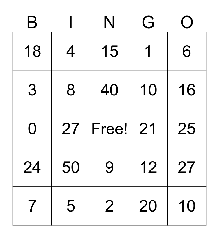 This bingo card has a free space and 24 words: 50, 5, 40, 7, 6, 18, 3, 4, 21, 9, 10, 0, 12, 27, 8, 20, 25, 15, 16, 27, 10, 24, 1 and 2.