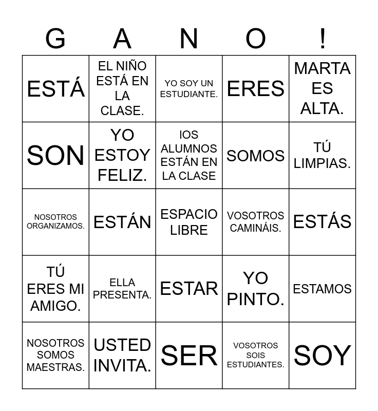 This bingo card has a free space and 34 words: TÚ ESTÁS EN LA CLASE., VOSOTROS SOIS ESTUDIANTES., ELLOS ESTÁN EN LA IGLESIA., VOSOTROS ESTÁIS FELICES., TÚ ERES MI AMIGO., YO ESTOY FELIZ., MARTA ES ALTA., NOSOTROS SOMOS MAESTRAS., EL NIÑO ESTÁ EN LA CLASE., lOS PROFESORES SON AMABLES., lOS ALUMNOS ESTÁN EN LA CLASE, YO SOY UN ESTUDIANTE., LA CLASE ES DIVERTIDO., EL ARTISTA UTILIZA., VOSOTROS CAMINÁIS., TÚ LIMPIAS., USTED INVITA., NOSOTROS ORGANIZAMOS., ELLA PRESENTA., YO PINTO., ESTAR, ESTOY, ESTÁ, ESTÁS, SER, SOY, ERES, ES, SOMOS, SON, SOIS, ESTÁN, ESTAMOS and NOSOTROS ESTAMOS FELICES..