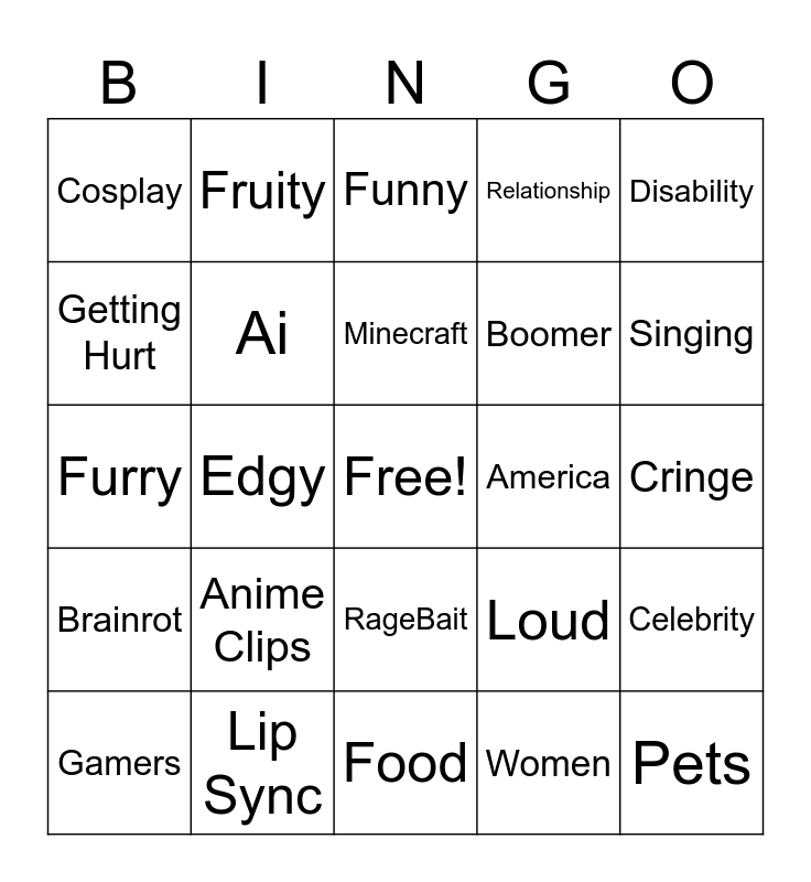 This bingo card has a free space and 24 words: Anime Clips, Lip Sync, Minecraft, Gamers, Disability, Cosplay, Getting Hurt, Fruity, America, RageBait, Boomer, Furry, Loud, Celebrity, Ai, Women, Cringe, Funny, Singing, Edgy, Pets, Brainrot, Relationship and Food.