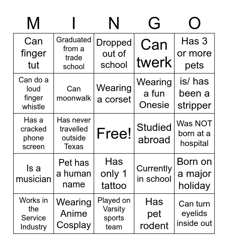 This bingo card has a free space and 49 words: Wearing Cat Ears, Can turn eyelids inside out, Fluent in 3 languages, Played on Varsity sports team, Pet has a human name, Has dual citizenship, Graduated from a trade school, Pun-based costume, Can do a loud finger whistle, Slutty "profession" costume, Can moonwalk, Can twerk, Born on a major holiday, Currently in school, Doesn't have a passport (at all), Has pet reptile, Wearing a corset, Studied abroad, 90's/00's cartoon/kid's show costume, Has 3 or more pets, Has never travelled outside Texas, Has pet rodent, Can finger tut, Wearing a fun Onesie, Met a celebrity, is/ has been a stripper, Works in the Service Industry, Pet has food name, Has only 1 tattoo, Is a musician, Has a lighter on their person, Born and raised in Austin, Has anime lockscreen/ wallpaper, Wearing a watch, Wearing Anime Cosplay, Works in IT, Dead dad club, Is/ was a DJ, Was NOT born at a hospital, Has a name that is also a noun, Can beatbox, Wearing Leather/PVC, Works in medical field, Can drive a stick shift, Has a cracked phone screen, Dropped out of school, Crochets, sews, or knits (etc), Has MAGA family and Not wearing a costume.