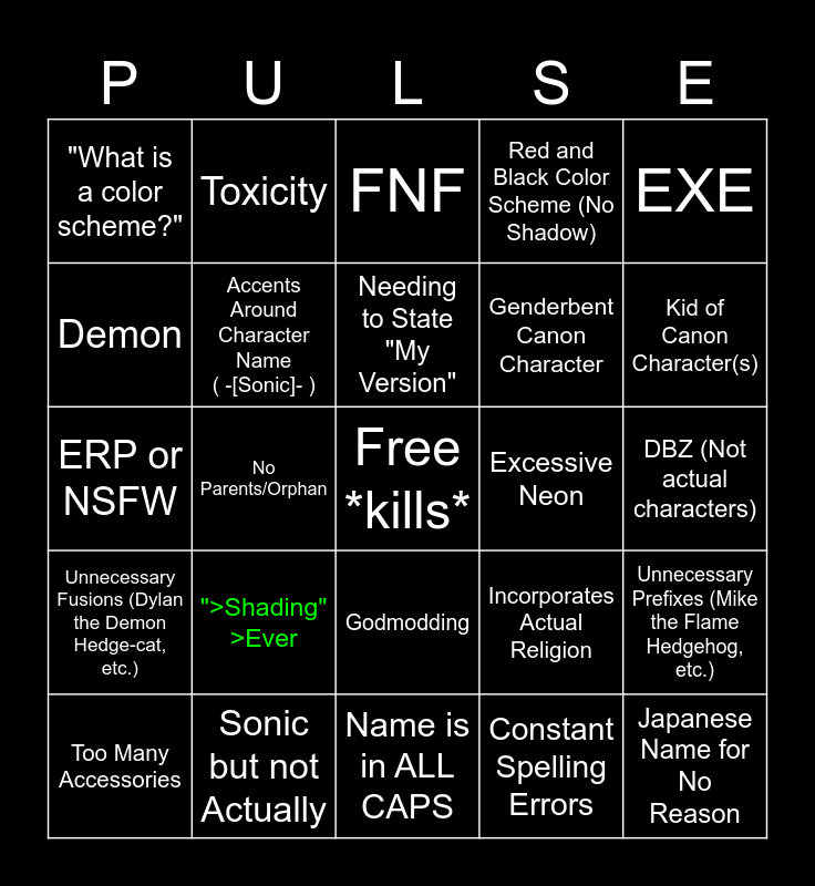 This bingo card has a free space and 24 words: ">Shading" >Ever, Sonic but not Actually, Needing to State "My Version", Too Many Accessories, EXE, "What is a color scheme?", Demon, Toxicity, Excessive Neon, Godmodding, Genderbent Canon Character, ERP or NSFW, Incorporates Actual Religion, Unnecessary Prefixes (Mike the Flame Hedgehog, etc.), Accents Around Character Name ( -[Sonic]- ), Constant Spelling Errors, DBZ (Not actual characters), FNF, Kid of Canon Character(s), No Parents/Orphan, Japanese Name for No Reason, Unnecessary Fusions (Dylan the Demon Hedge-cat, etc.), Red and Black Color Scheme (No Shadow) and Name is in ALL CAPS.