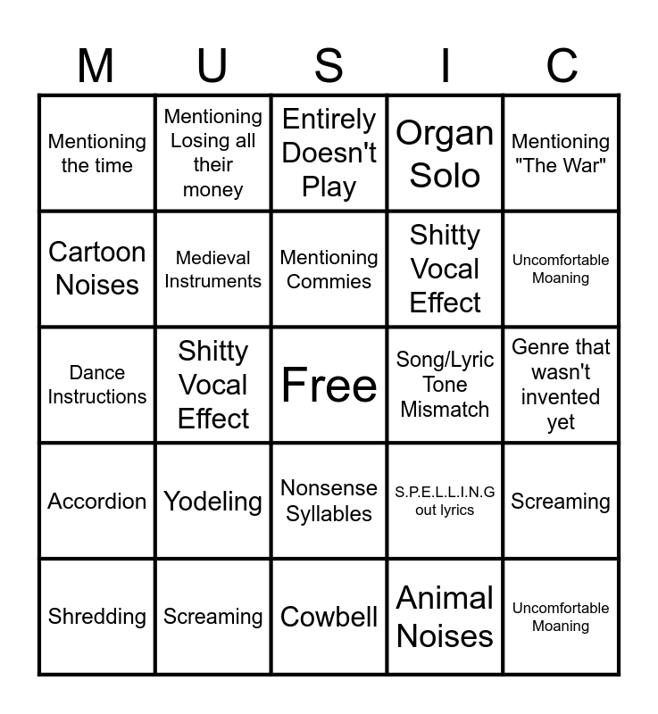This bingo card has a free space and 92 words: Saxophone Jumpscare, Slurs, Cowbell, Bongos, Saying their own name, Mentioning the current year, Mentioning the far future, Shredding, Spousal Murder, Unintelligible, Admission of a crime, Cartoon Noises, Lasers, Shitty Vocal Effect, Cliche Spoken Song Introduction, Mentioning "The War", Entirely Doesn't Play, Backwards Sounds, Non English, Animal Noises, Political Endorsement, Audible Individual In The Crowd, Thanking Nonexistent Audience, Uncut Intermission, Yodeling, Medieval Instruments, Organ Solo, Acapella Jumpscare, Baked Good Romance Metaphor, Brand Name, Screaming, Nonsense Syllables, Listing Material Possessions, Naming a Foreign Country, Mentioning Losing all their money, Song/Lyric Tone Mismatch, Mentioning the time, Overly Hippie Protest, Mentioning Commies, S.P.E.L.L.I.N.G out lyrics, Dance Instructions, Accordion, Genre that wasn't invented yet, changing radio station noises, Uncomfortable Moaning, Child lead singer, Saxophone Jumpscare, Slurs, Cowbell, Bongos, Saying their own name, Mentioning the current year, Mentioning the far future, Shredding, Spousal Murder, Unintelligible, Admission of a crime, Cartoon Noises, Lasers, Shitty Vocal Effect, Cliche Spoken Song Introduction, Mentioning "The War", Entirely Doesn't Play, Backwards Sounds, Non English, Animal Noises, Political Endorsement, Audible Individual In The Crowd, Thanking Nonexistent Audience, Uncut Intermission, Yodeling, Medieval Instruments, Organ Solo, Acapella Jumpscare, Baked Good Romance Metaphor, Brand Name, Screaming, Nonsense Syllables, Listing Material Possessions, Naming a Foreign Country, Mentioning Losing all their money, Song/Lyric Tone Mismatch, Mentioning the time, Overly Hippie Protest, Mentioning Commies, S.P.E.L.L.I.N.G out lyrics, Dance Instructions, Accordion, Genre that wasn't invented yet, changing radio station noises, Uncomfortable Moaning and Child lead singer.