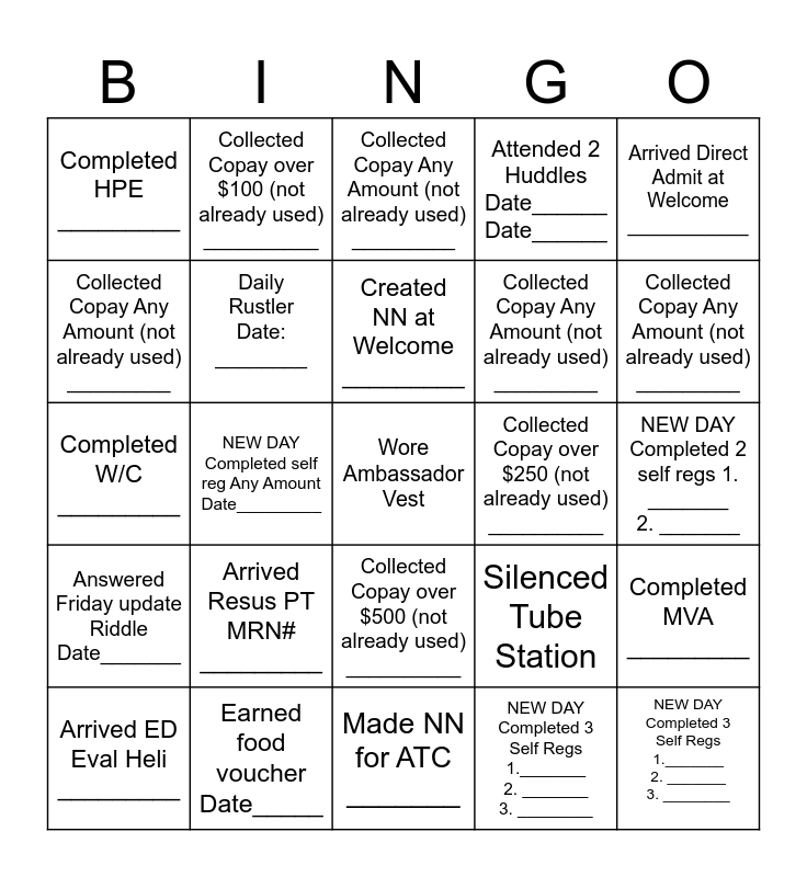 This bingo card has 25 words: Arrived Resus PT MRN# _________, Made NN for ATC _______, Created NN at Welcome _________, Arrived ED Eval Heli _________, Arrived Direct Admit at Welcome ___________, Completed HPE _________, Collected Copay Any Amount (not already used) _________, Collected Copay over $100 (not already used) __________, Collected Copay over $250 (not already used) __________, Collected Copay over $500 (not already used) __________, Collected Copay Any Amount (not already used) _________, Completed W/C _________, Silenced Tube Station, Completed MVA _________, Daily Rustler Date: ________, NEW DAY Completed 3 Self Regs 1._______ 2. _______ 3. ________, NEW DAY Completed 2 self regs 1. _______ 2. _______, Collected Copay Any Amount (not already used) _________, Collected Copay Any Amount (not already used) _________, NEW DAY Completed self reg Any Amount Date_________, Wore Ambassador Vest, Earned food voucher Date_____, Answered Friday update Riddle Date_______, Attended 2 Huddles Date______ Date______ and NEW DAY Completed 3 Self Regs 1._______ 2. _______ 3. ________.