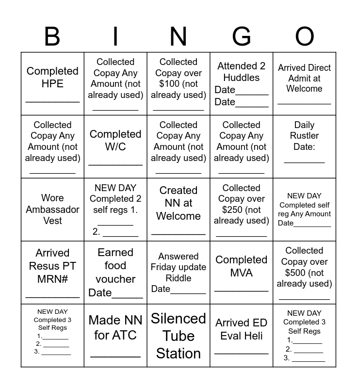 This bingo card has 25 words: Arrived Resus PT MRN# _________, Made NN for ATC _______, Created NN at Welcome _________, Arrived ED Eval Heli _________, Arrived Direct Admit at Welcome ___________, Completed HPE _________, Collected Copay Any Amount (not already used) _________, Collected Copay over $100 (not already used) __________, Collected Copay over $250 (not already used) __________, Collected Copay over $500 (not already used) __________, Collected Copay Any Amount (not already used) _________, Completed W/C _________, Silenced Tube Station, Completed MVA _________, Daily Rustler Date: ________, NEW DAY Completed 3 Self Regs 1._______ 2. _______ 3. ________, NEW DAY Completed 2 self regs 1. _______ 2. _______, Collected Copay Any Amount (not already used) _________, Collected Copay Any Amount (not already used) _________, NEW DAY Completed self reg Any Amount Date_________, Wore Ambassador Vest, Earned food voucher Date_____, Answered Friday update Riddle Date_______, Attended 2 Huddles Date______ Date______ and NEW DAY Completed 3 Self Regs 1._______ 2. _______ 3. ________.