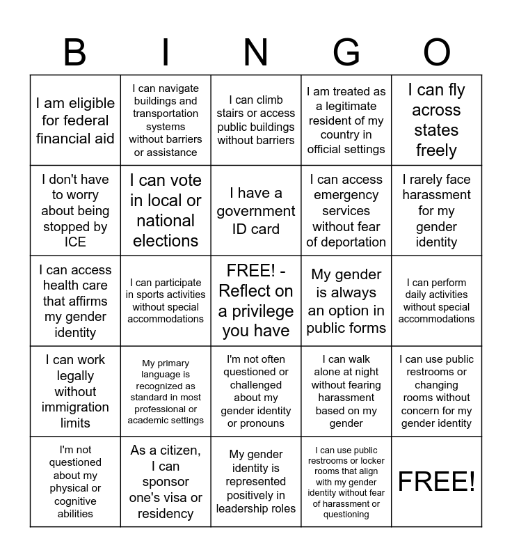 This bingo card has a free space and 24 words: My primary language is recognized as standard in most professional or academic settings, As a citizen, I can sponsor one's visa or residency, I have a government ID card, I'm not questioned about my physical or cognitive abilities, I can fly across states freely, I am eligible for federal financial aid, I don't have to worry about being stopped by ICE, I can navigate buildings and transportation systems without barriers or assistance, My gender is always an option in public forms, I'm not often questioned or challenged about my gender identity or pronouns, I can access emergency services without fear of deportation, I can access health care that affirms my gender identity, I can walk alone at night without fearing harassment based on my gender, I can use public restrooms or changing rooms without concern for my gender identity, I can vote in local or national elections, I can use public restrooms or locker rooms that align with my gender identity without fear of harassment or questioning, I can perform daily activities without special accommodations, I can climb stairs or access public buildings without barriers, I rarely face harassment for my gender identity, I can participate in sports activities without special accommodations, FREE!, I can work legally without immigration limits, I am treated as a legitimate resident of my country in official settings and My gender identity is represented positively in leadership roles.
