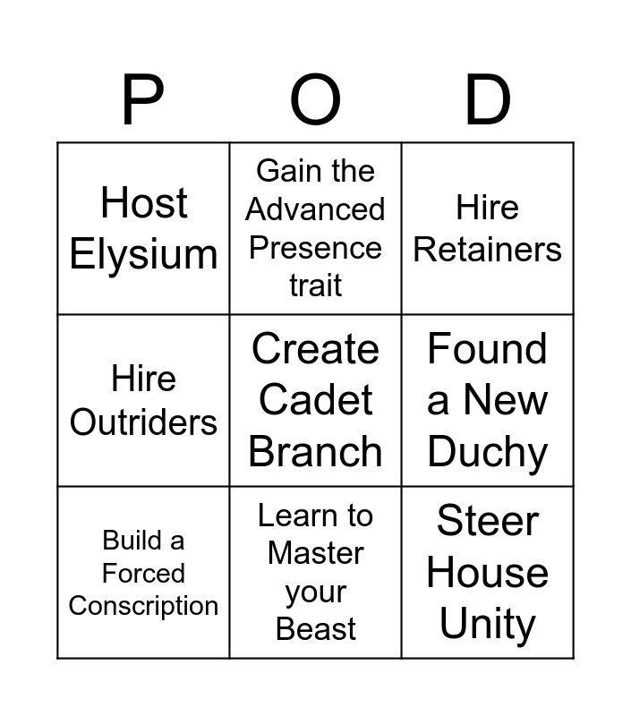 This bingo card has 68 words: Gain the Diplomat trait, Gain the August trait, Gain the Patriarch trait, Gain the Advanced Celerity trait, Gain the Advanced Potence trait, Gain the Advanced Auspex trait, Gain the Advanced Presence trait, Learn new Abilities, Learn to Master your Beast, Reveal yourself to the Vatican, Go on a Brujah Panegyra, Go on a Pilgrimage, Take the decision to rebuild the Empire of Carthage, Create Cadet Branch, Found Holy Order, Found a New Duchy, Start a Power Struggle, Host Elysium, Surey your Capital, Enter Torpor, Steer House Unity, Commission Artifact, Convert to Local Culture, Romance Ikkenai, Hire a Personal Physician, Hire a Caravan Master, Hire an Antiquarian, Hire a Seneschal, Hire Touchstones, Hire Disgraced Nobles, Hire Retainers, Hire Poachers, Hire Rabble, Hire Caballeros, Hire Outriders, Hire Mob, Hire Brujah Agitators, Hire The Twilight Order, Hire Saboteurs, Hire Engineers, Hire Sappers, Build a Blood Tax, Build a Forced Conscription, Build an Open Rule, Build an Influencing the Barracks, Build an Influencing the Burghers, Build an Influencing the Lawgivers, Build an Influencing the Merchants, Build an Influencing the Nobles, Build an Influencing the Night Watch, Build an Influencing the Rabble and Thugs, Build an Influencing the Outriders, Build an Influencing the Underworld, Build an Influencing the People, Upgrade Castle, Pass High Crown Authority, Upgrade Hideout, Build Haven Defenses, Build Servant Quarters, Build Stable and Kennel, Build Military Quarters, Build Nightly Caravan, Build Ambassador Quarters, Build Ashen Faiths Congregations, Become a Duke, Create New Humanity Faith, As a Vampire, add someone with acute Resonance to your Herd and Steal at least 200 gold during a single Infiltration Mission.