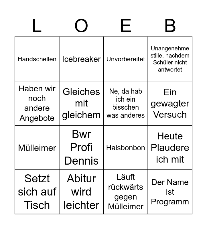 This bingo card has 23 words: Der Name ist Programm, Deutschland geht den Bach runter, Ein gewagter Versuch, Steht im weg wenn Schüler von Toilette kommt, Haben wir noch andere Angebote, Handschellen, Gleiches mit gleichem, Icebreaker, Setzt sich auf Tisch, 2*5= 10, Bwr Profi Dennis, Mülleimer, Ihr erinnert euch vllt aus der 12. Klasse, 50/50 Bwr, Abitur wird leichter, Ich hab euch da mal was vorbereitet, Unvorbereitet, Halsbonbon, Ne, da hab ich ein bisschen was anderes, Heute Plaudere ich mit, Unangenehme stille, nachdem Schüler nicht antwortet, Läuft rückwärts gegen Mülleimer and Schaut kommentarlos über Schulter.