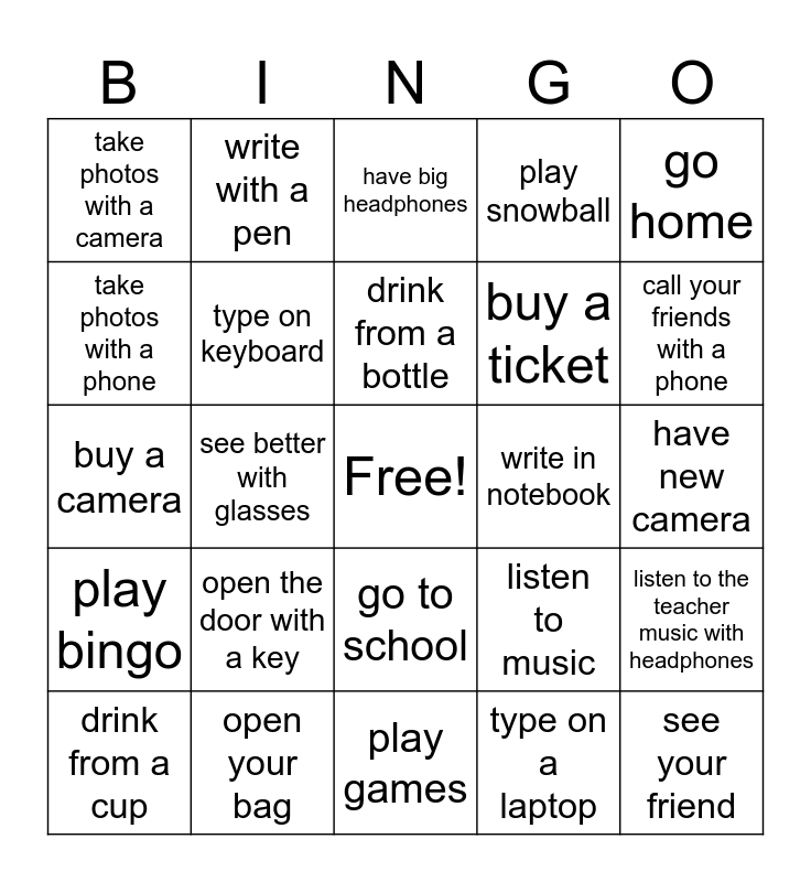 This bingo card has a free space and 24 words: open the door with a key, open your bag, drink from a bottle, drink from a cup, go home, take photos with a camera, take photos with a phone, write with a pen, write in notebook, go to school, buy a ticket, buy a camera, listen to music, listen to the teacher music with headphones, type on keyboard, type on a laptop, have new camera, have big headphones, call your friends with a phone, see better with glasses, see your friend, play bingo, play snowball and play games.