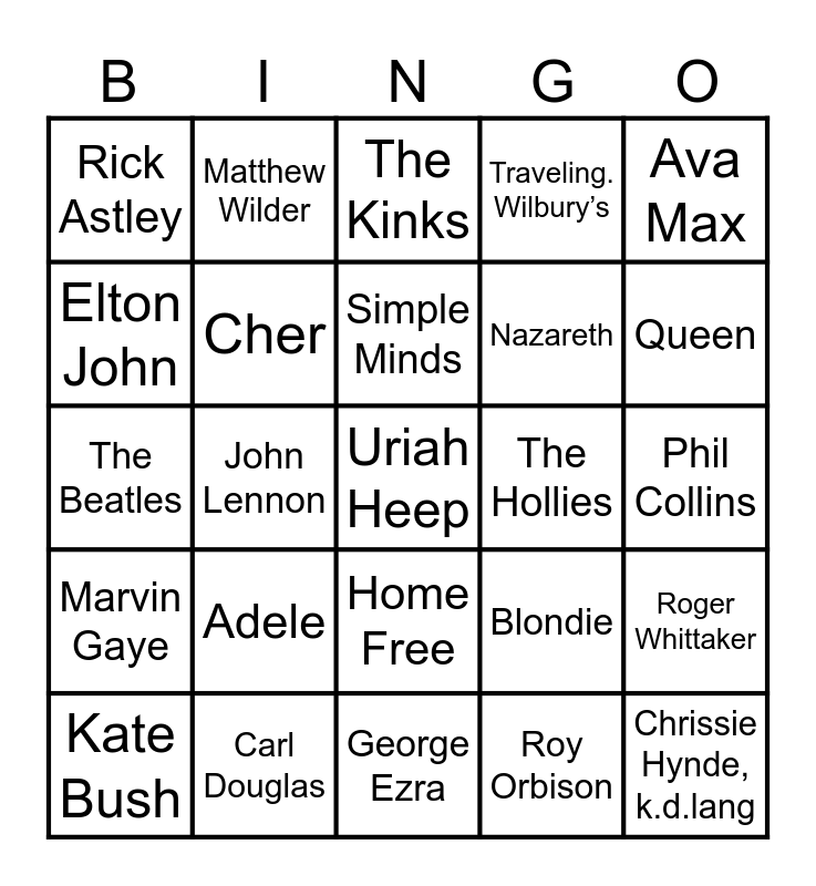 This bingo card has 25 words: Adele, George Ezra, Simple Minds, Kate Bush, Ava Max, Rick Astley, Elton John, Matthew Wilder, The Hollies, Home Free, Nazareth, The Beatles, Blondie, Roger Whittaker, Cher, Chrissie Hynde, k.d.lang, Phil Collins, The Kinks, Queen, John Lennon, Uriah Heep, Carl Douglas, Marvin Gaye, Traveling. Wilbury’s and Roy Orbison.
