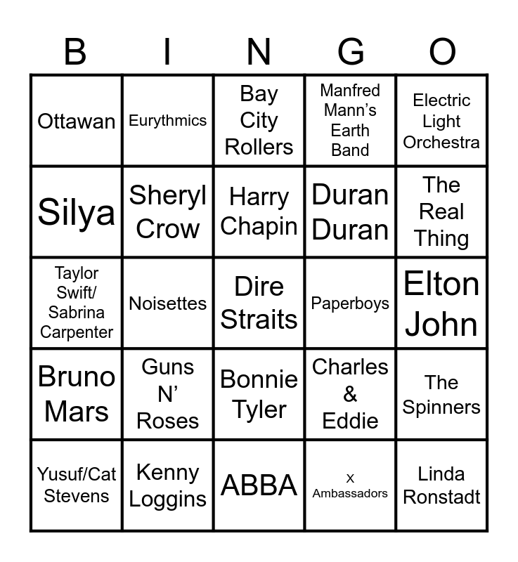 This bingo card has 25 words: Guns N’ Roses, ABBA, Harry Chapin, Yusuf/Cat Stevens, Electric Light Orchestra, Ottawan, Silya, Eurythmics, Paperboys, Bonnie Tyler, Duran Duran, Taylor Swift/ Sabrina Carpenter, Charles & Eddie, The Spinners, Sheryl Crow, Linda Ronstadt, Elton John, Bay City Rollers, The Real Thing, Noisettes, Dire Straits, Kenny Loggins, Bruno Mars, Manfred Mann’s Earth Band and X Ambassadors.
