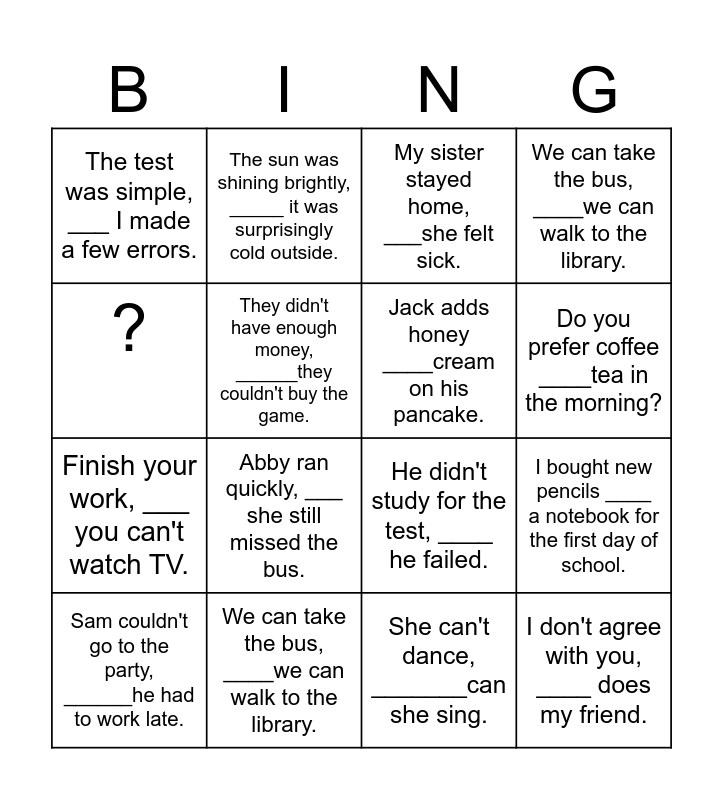 This bingo card has 16 words: We can take the bus, ____we can walk to the library., I bought new pencils ____ a notebook for the first day of school., My sister stayed home, ___she felt sick., The test was simple, ___ I made a few errors., Finish your work, ___ you can't watch TV., The sun was shining brightly, _____ it was surprisingly cold outside., He didn't study for the test, ____ he failed., She can't dance, _______can she sing., ?, They didn't have enough money, ______they couldn't buy the game., Sam couldn't go to the party, ______he had to work late., We can take the bus, ____we can walk to the library., Abby ran quickly, ___ she still missed the bus., Do you prefer coffee ____tea in the morning?, Jack adds honey ____cream on his pancake. and I don't agree with you, ____ does my friend..
