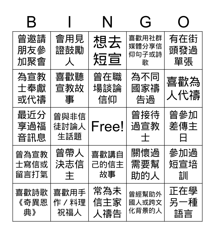 This bingo card has a free space and 25 words: 曾帶人決志信主, 常為未信主家人禱告, 曾在職場談論信仰, 喜歡詩歌《奇異恩典》, 有在街頭發過單張, 曾邀請朋友參加聚會, 為宣教士奉獻或代禱, 會用見證鼓勵人, 曾接待過宣教士, 喜歡講自己的信主故事, 為不同國家禱告過, 最近分享過福音訊息, 關懷過需要幫助的人, 參加過短宣培訓, 喜歡聽宣教故事, 曾為病人禱告, 曾參加差傳主日, 想去短宣, 喜歡為人代禱, 曾與非信徒討論人生話題, 正在學另一種語言, 喜歡用手作/料理祝福人, 曾為宣教士寫信或留言打氣, 喜歡用社群媒體分享信仰句子或詩歌 and 曾經幫助外國人或跨文化背景的人.
