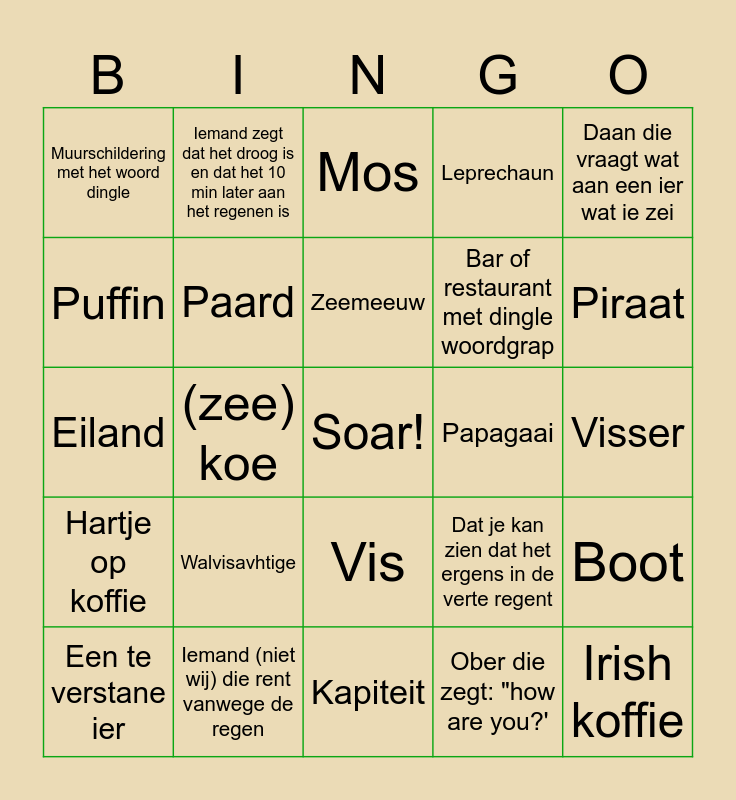 This bingo card has a free space and 24 words: Walvisavhtige, Iemand (niet wij) die rent vanwege de regen, Zeemeeuw, Een te verstane ier, Daan die vraagt wat aan een ier wat ie zei, Muurschildering met het woord dingle, Puffin, Iemand zegt dat het droog is en dat het 10 min later aan het regenen is, Papagaai, Vis, Bar of restaurant met dingle woordgrap, Eiland, Dat je kan zien dat het ergens in de verte regent, Boot, Paard, Ober die zegt: "how are you?', Visser, Mos, Piraat, (zee) koe, Irish koffie, Hartje op koffie, Leprechaun and Kapiteit.