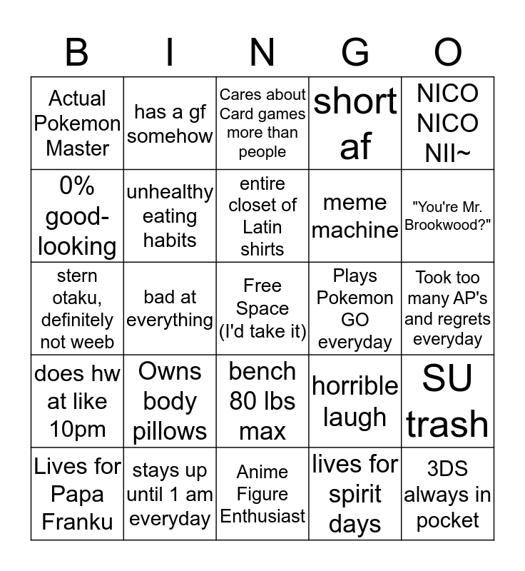 This bingo card has a free space and 24 words: Owns body pillows, stays up until 1 am everyday, entire closet of Latin shirts, Lives for Papa Franku, NICO NICO NII~, Actual Pokemon Master, 0% good-looking, has a gf somehow, Plays Pokemon GO everyday, bench 80 lbs max, meme machine, stern otaku, definitely not weeb, horrible laugh, SU trash, unhealthy eating habits, lives for spirit days, Took too many AP's and regrets everyday, Cares about Card games more than people, "You're Mr. Brookwood?", bad at everything, 3DS always in pocket, does hw at like 10pm, short af and Anime Figure Enthusiast.