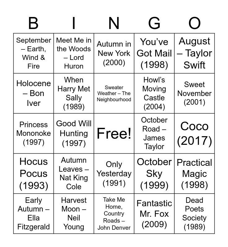 This bingo card has a free space and 24 words: Autumn Leaves – Nat King Cole, Harvest Moon – Neil Young, Sweater Weather – The Neighbourhood, Early Autumn – Ella Fitzgerald, August – Taylor Swift, September – Earth, Wind & Fire, Holocene – Bon Iver, Meet Me in the Woods – Lord Huron, October Road – James Taylor, Only Yesterday (1991), Howl’s Moving Castle (2004), Princess Mononoke (1997), October Sky (1999), Practical Magic (1998), When Harry Met Sally (1989), Fantastic Mr. Fox (2009), Coco (2017), Autumn in New York (2000), Sweet November (2001), Good Will Hunting (1997), Dead Poets Society (1989), Hocus Pocus (1993), You’ve Got Mail (1998) and Take Me Home, Country Roads – John Denver.