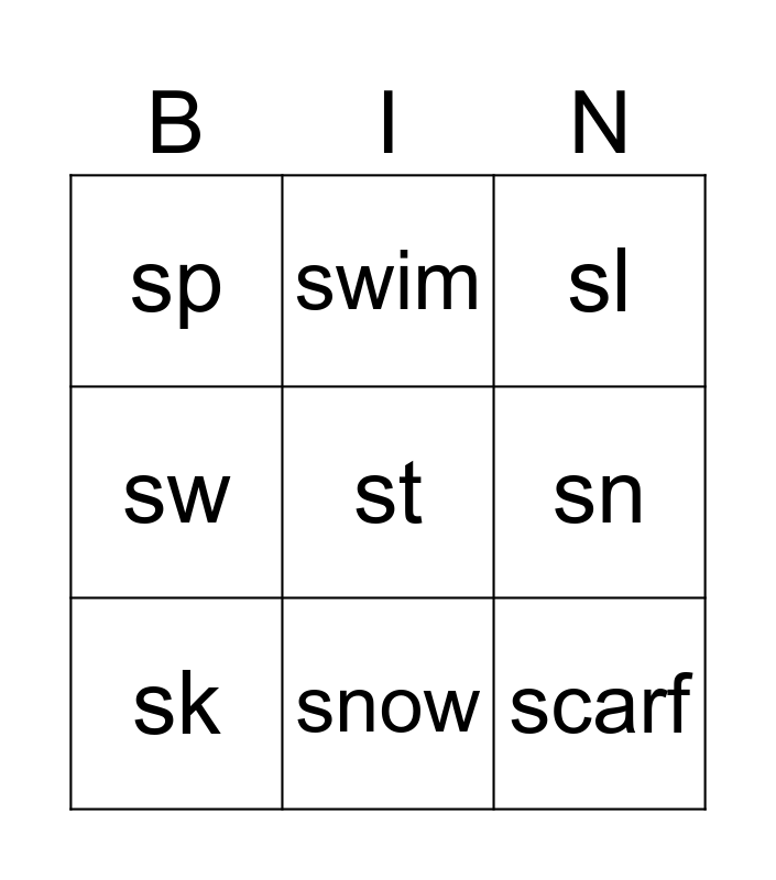 This bingo card has 9 words: sk, sl, swim, sw, sp, sn, st, scarf and snow.