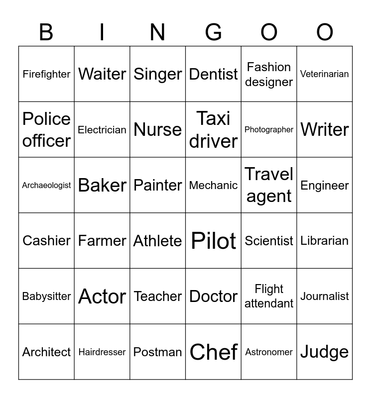 This bingo card has 36 words: Doctor, Teacher, Chef, Police officer, Cashier, Mechanic, Electrician, Postman, Fashion designer, Flight attendant, Writer, Dentist, Journalist, Baker, Taxi driver, Firefighter, Babysitter, Travel agent, Archaeologist, Singer, Painter, Farmer, Pilot, Athlete, Scientist, Waiter, Photographer, Hairdresser, Nurse, Veterinarian, Judge, Architect, Librarian, Engineer, Actor and Astronomer.