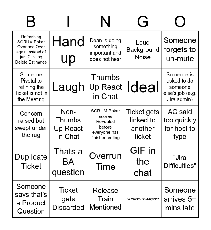This bingo card has 54 words: Free!, Duplicate Ticket, Conscious of Time, Let's have a great day, Overrun Time, BRB, Loud Background Noise, Meeting started by Developer, Someone Pivotal to refining the Ticket is not in the Meeting, Someone has to leave Early for another Meeting, Refreshing SCRUM Poker Over and Over again instead of just Clicking Delete Estimates, Ticket Assigned 3 SP for no Reason, Ticket gets Discarded, Someone says that's a Product Question, Someone is called out for not Pointing a Ticket, Release Train Mentioned, SCRUM Poker scores Revealed before everyone has finished voting, Ideal, "I'm just listening in", AC said too quickly for host to type, GIF in the chat, AWS Mentioned, Ticket gets linked to another ticket, Someone forgets to un-mute, Milton Anecdote, Hand up, Too long on a ticket (15 mins), Verbatim reads description to explain ticket, Someone gets talked over/interupted, "Attack"/"Weapon", UCD team there but nothing is asked of them, "[yeah, but no]", "Could you repeat that?" (Not listening), Talk about old/in-progress tickets, Dean is doing something important and does not hear, Points assigned without unanimous vote, Concern raised but swept under the rug, "Jira Difficulties", Someone arrives 5+ mins late, Laugh, 5+ min unrelated starting chat, WebOps mentioned, Comment left on ticket, QAs there but nothing is asked of them, Thats a BA question, Ticket assigned to Developer, Backlog ticket added to current sprint, Non BG member mentioned, Thumbs Up React in Chat, Non-Thumbs Up React in Chat, Someone is asked to do someone else's job (e.g. Jira admin), No one offers to be assigned to a ticket, "Let me start screen sharing" and "Thanks everyone".