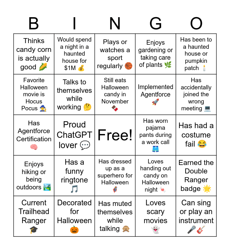 This bingo card has a free space and 26 words: Has dressed up as a superhero for Halloween π¦ΈββοΈ, Loves scary movies π», Still eats Halloween candy in November π«, Decorated for Halloween π, Has been to a haunted house or pumpkin patch π―οΈ, Thinks candy corn is actually good π½, Favorite Halloween movie is Hocus Pocus π§ββοΈ, Would spend a night in a haunted house for $1M π°, Has had a costume fail π, Loves handing out candy on Halloween night π¬, Implemented Agentforce π, Has Agentforce Certification π§ , Earned the Double Ranger badge π, Current Trailhead Ranger π, Proud ChatGPT lover π¬, Attended Dreamforce π, Enjoys gardening or taking care of plants πΏ, Enjoys hiking or being outdoors ποΈ, Plays or watches a sport regularly π, Can sing or play an instrument π€πΈ, Has accidentally joined the wrong meeting π», Has muted themselves while talking π, Has worn pajama pants during a work call π©³, Has a funny ringtone π΅, Talks to themselves while working π€ and Knows at least one TikTok dance πΊ.
