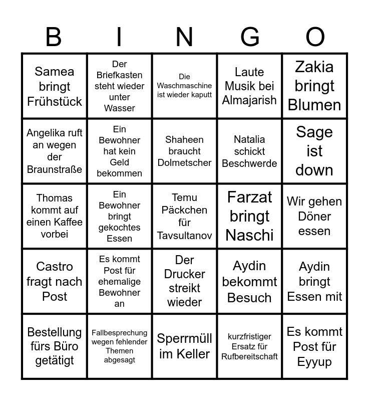This bingo card has 25 words: Castro fragt nach Post, Fallbesprechung wegen fehlender Themen abgesagt, Temu Päckchen für Tavsultanov, kurzfristiger Ersatz für Rufbereitschaft, Zakia bringt Blumen, Samea bringt Frühstück, Der Briefkasten steht wieder unter Wasser, Die Waschmaschine ist wieder kaputt, Farzat bringt Naschi, Aydin bringt Essen mit, Angelika ruft an wegen der Braunstraße, Ein Bewohner hat kein Geld bekommen, Sperrmüll im Keller, Aydin bekommt Besuch, Sage ist down, Bestellung fürs Büro getätigt, Ein Bewohner bringt gekochtes Essen, Shaheen braucht Dolmetscher, Natalia schickt Beschwerde, Wir gehen Döner essen, Thomas kommt auf einen Kaffee vorbei, Es kommt Post für ehemalige Bewohner an, Der Drucker streikt wieder, Laute Musik bei Almajarish and Es kommt Post für Eyyup.