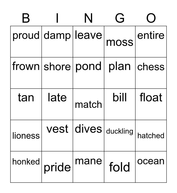 This bingo card has 25 words: vest, mane, pond, honked, entire, proud, frown, damp, bill, dives, plan, tan, duckling, hatched, shore, ocean, float, leave, chess, late, match, pride, lioness, moss and fold.