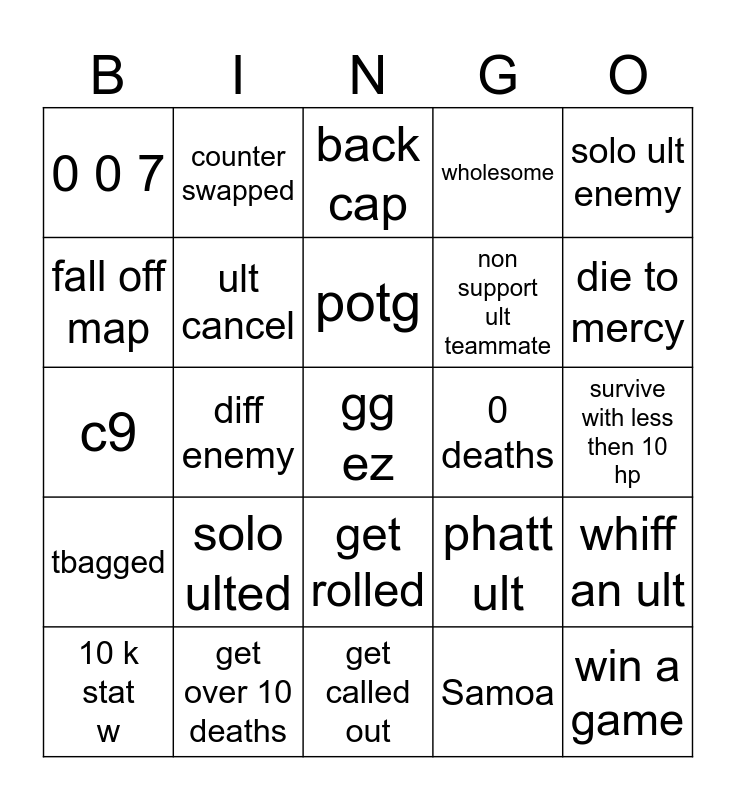 This bingo card has a free space and 24 words: solo ulted, get over 10 deaths, potg, 10 k stat w, solo ult enemy, 0 0 7, fall off map, counter swapped, 0 deaths, get rolled, non support ult teammate, c9, phatt ult, whiff an ult, ult cancel, Samoa, survive with less then 10 hp, back cap, die to mercy, diff enemy, win a game, tbagged, wholesome and get called out.