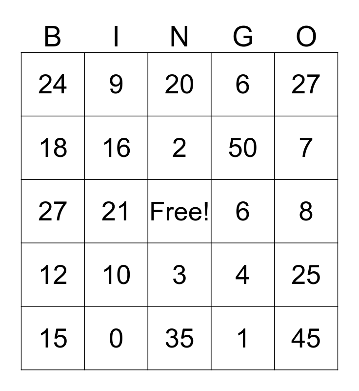 This bingo card has a free space and 24 words: 10, 0, 2, 15, 27, 24, 18, 9, 6, 3, 50, 27, 4, 25, 16, 1, 8, 20, 7, 21, 45, 12, 6 and 35.