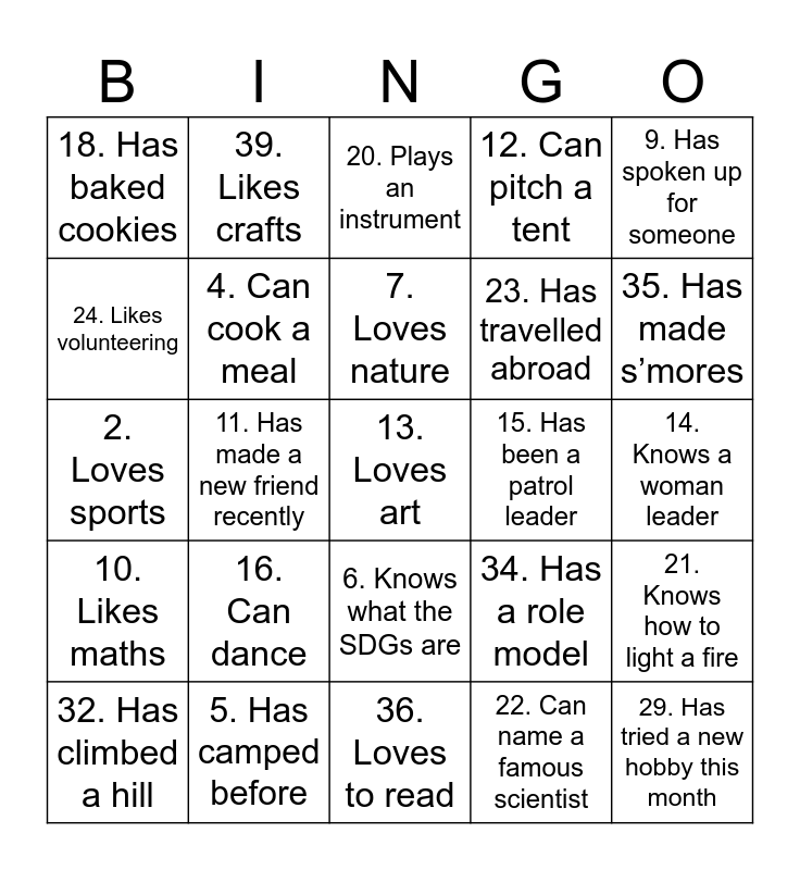 This bingo card has 40 words: Has a sister, 2. Loves sports, 3. Has led a team, 4. Can cook a meal, 5. Has camped before, 6. Knows what the SDGs are, 7. Loves nature, 8. Can whistle, 9. Has spoken up for someone, 10. Likes maths, 11. Has made a new friend recently, 12. Can pitch a tent, 13. Loves art, 14. Knows a woman leader, 15. Has been a patrol leader, 16. Can dance, 17. Likes coding or tech, 18. Has baked cookies, 19. Loves animals, 20. Plays an instrument, 21. Knows how to light a fire, 22. Can name a famous scientist, 23. Has travelled abroad, 24. Likes volunteering, 25. Wants to change the world, 26. Has a pet, 27. Can speak two languages, 28. Likes hiking, 29. Has tried a new hobby this month, 30. Has done community service, 31. Knows the Guide Promise, 32. Has climbed a hill, 33. Likes helping others, 34. Has a role model, 35. Has made s’mores, 36. Loves to read, 37. Knows a fun camp song, 38. Has planted something, 39. Likes crafts and 40. Has tried origami.