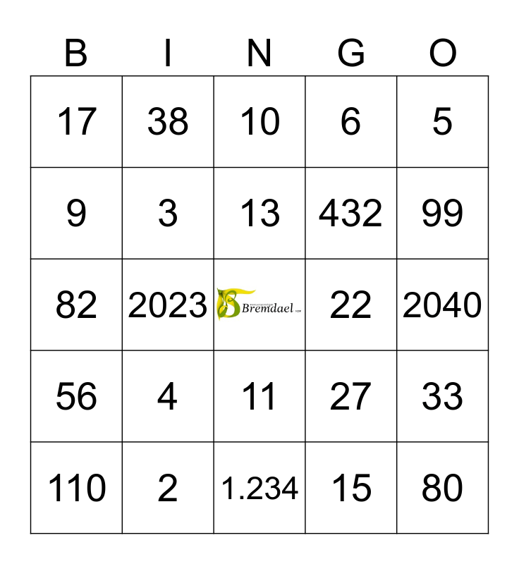 This bingo card has a free space and 35 words: 8, 78, 42, 3, 11, 6, 9, 14, 13, 7, 82, 5, 12, 21, 17, 22, 15, 2023, 56, 80, 27, 110, 33, 2, 10, 99, 68, 1.000, 432, 2040, 12, 1.234, 4, 38 and 100.