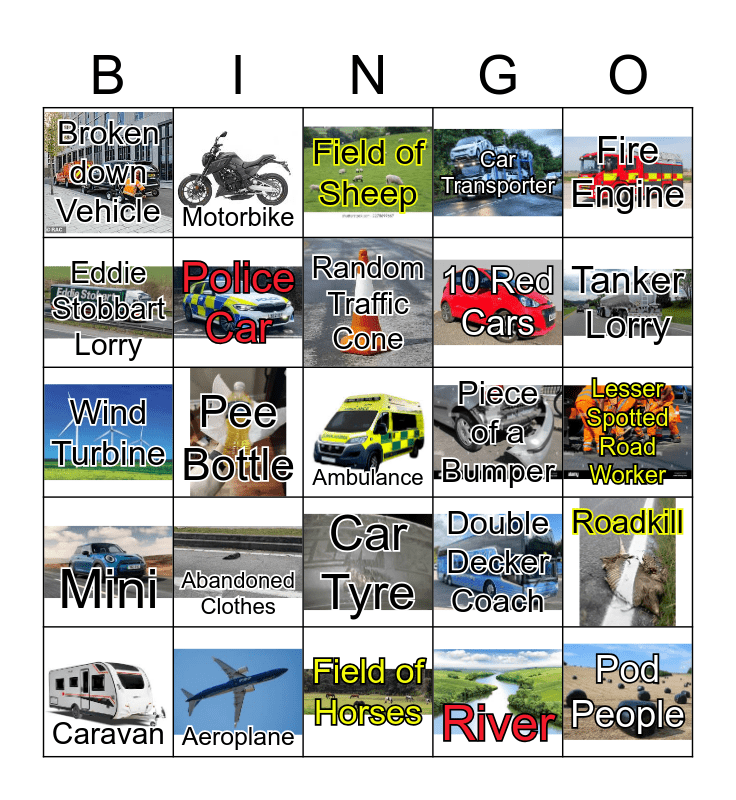 This bingo card has 24 images, a free space and 24 words: Abandoned Clothes, Aeroplane, Random Traffic Cone, Caravan, Fire Engine, Broken down Vehicle, Eddie Stobbart Lorry, Motorbike, Piece of a Bumper, Car Tyre, 10 Red Cars, Wind Turbine, Double Decker Coach, Roadkill, Police Car, River, Lesser Spotted Road Worker, Field of Sheep, Tanker Lorry, Pee Bottle, Pod People, Mini, Car Transporter and Field of Horses.