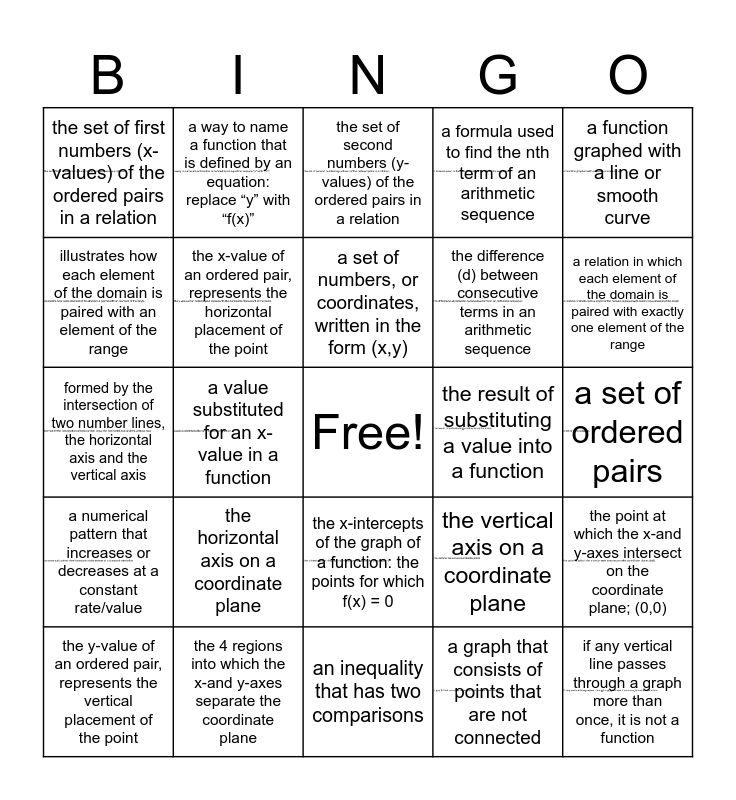 This bingo card has 19 images, a free space and 24 words: the horizontal axis on a coordinate plane, the 4 regions into which the x-and y-axes separate the coordinate plane, a set of numbers, or coordinates, written in the form (x,y), the y-value of an ordered pair, represents the vertical placement of the point, a function graphed with a line or smooth curve, the set of first numbers (x-values) of the ordered pairs in a relation, illustrates how each element of the domain is paired with an element of the range, a way to name a function that is defined by an equation: replace “y” with “f(x)”, the result of substituting a value into a function, the x-intercepts of the graph of a function: the points for which f(x) = 0, the difference (d) between consecutive terms in an arithmetic sequence, formed by the intersection of two number lines, the horizontal axis and the vertical axis, the vertical axis on a coordinate plane, the point at which the x-and y-axes intersect on the coordinate plane; (0,0), the x-value of an ordered pair, represents the horizontal placement of the point, a graph that consists of points that are not connected, a set of ordered pairs, the set of second numbers (y-values) of the ordered pairs in a relation, a relation in which each element of the domain is paired with exactly one element of the range, a value substituted for an x-value in a function, if any vertical line passes through a graph more than once, it is not a function, a numerical pattern that increases or decreases at a constant rate/value, a formula used to find the nth term of an arithmetic sequence and an inequality that has two comparisons.