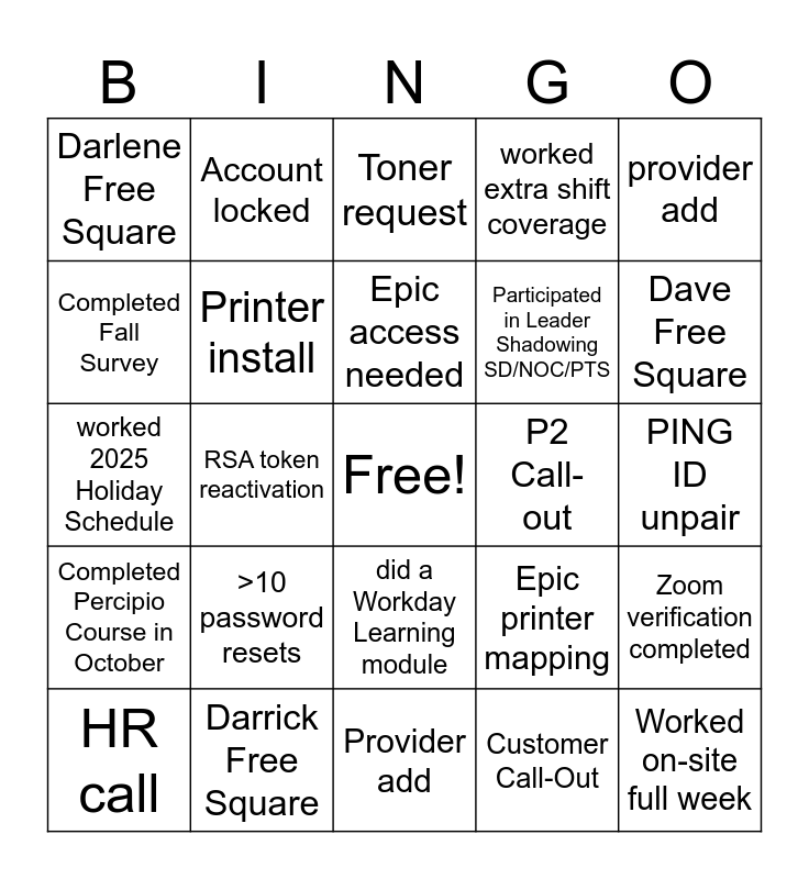 This bingo card has a free space and 24 words: >10 password resets, Darrick Free Square, Epic access needed, HR call, provider add, Darlene Free Square, Completed Fall Survey, Account locked, P2 Call-out, did a Workday Learning module, Participated in Leader Shadowing SD/NOC/PTS, worked 2025 Holiday Schedule, Epic printer mapping, Zoom verification completed, Printer install, Customer Call-Out, PING ID unpair, Toner request, Dave Free Square, RSA token reactivation, Worked on-site full week, Completed Percipio Course in October, worked extra shift coverage and Provider add.