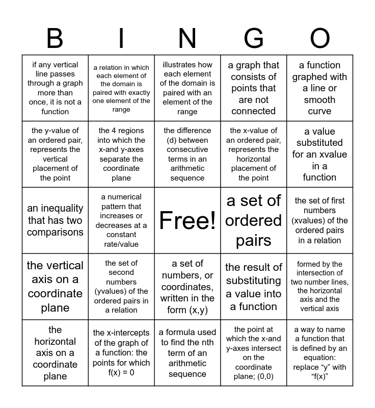This bingo card has a free space and 24 words: the set of second numbers (yvalues) of the ordered pairs in a relation, the x-intercepts of the graph of a function: the points for which f(x) = 0, the difference (d) between consecutive terms in an arithmetic sequence, the horizontal axis on a coordinate plane, a function graphed with a line or smooth curve, if any vertical line passes through a graph more than once, it is not a function, the y-value of an ordered pair, represents the vertical placement of the point, a relation in which each element of the domain is paired with exactly one element of the range, a set of ordered pairs, a set of numbers, or coordinates, written in the form (x,y), the x-value of an ordered pair, represents the horizontal placement of the point, an inequality that has two comparisons, the result of substituting a value into a function, formed by the intersection of two number lines, the horizontal axis and the vertical axis, the 4 regions into which the x-and y-axes separate the coordinate plane, the point at which the x-and y-axes intersect on the coordinate plane; (0,0), the set of first numbers (xvalues) of the ordered pairs in a relation, illustrates how each element of the domain is paired with an element of the range, a value substituted for an xvalue in a function, a numerical pattern that increases or decreases at a constant rate/value, a way to name a function that is defined by an equation: replace “y” with “f(x)”, the vertical axis on a coordinate plane, a graph that consists of points that are not connected and a formula used to find the nth term of an arithmetic sequence.