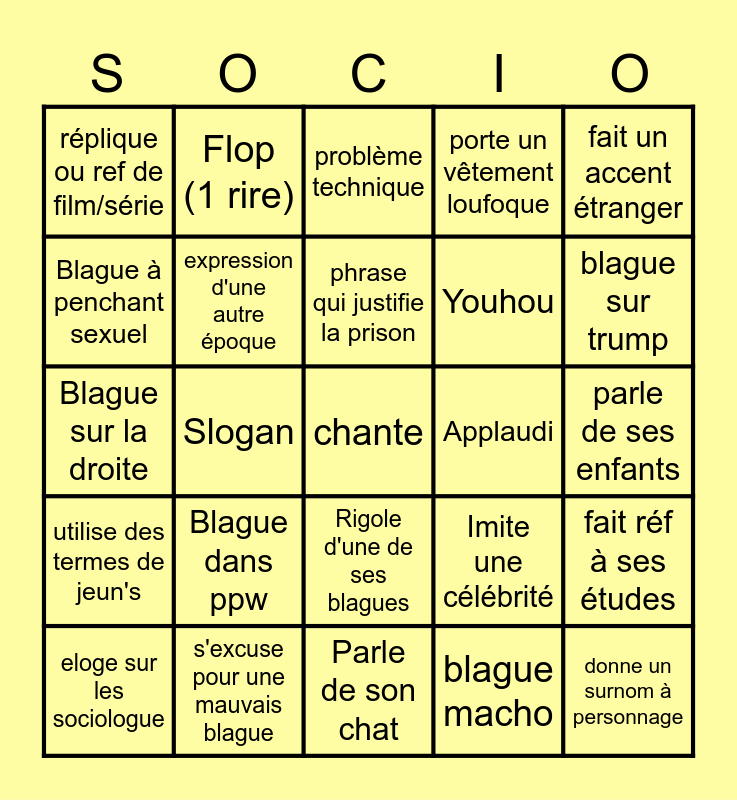 This bingo card has 25 words: Blague dans ppw, Parle de son chat, phrase qui justifie la prison, eloge sur les sociologue, fait un accent étranger, réplique ou ref de film/série, Blague à penchant sexuel, Flop (1 rire), Applaudi, Rigole d'une de ses blagues, Youhou, Blague sur la droite, Imite une célébrité, fait réf à ses études, expression d'une autre époque, donne un surnom à personnage, parle de ses enfants, problème technique, blague sur trump, Slogan, chante, s'excuse pour une mauvais blague, utilise des termes de jeun's, porte un vêtement loufoque and blague macho.