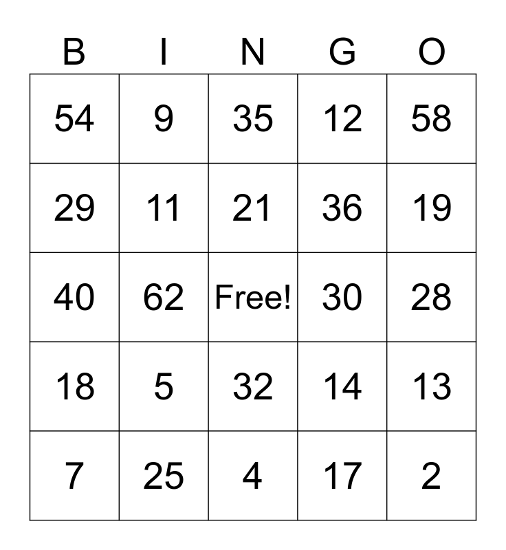 This bingo card has a free space and 48 words: 1, 2, 3, 4, 5, 10, 9, 8, 29, 6, 11, 12, 13, 14, 15, 16, 21, 30, 45, 58, 62, 17, 54, 36, 18, 19, 7, 9, 32, 18, 19, 22, 23, 24, 25, 26, 27, 28, 31, 32, 33, 34, 35, 39, 40, 50, 60 and 57.