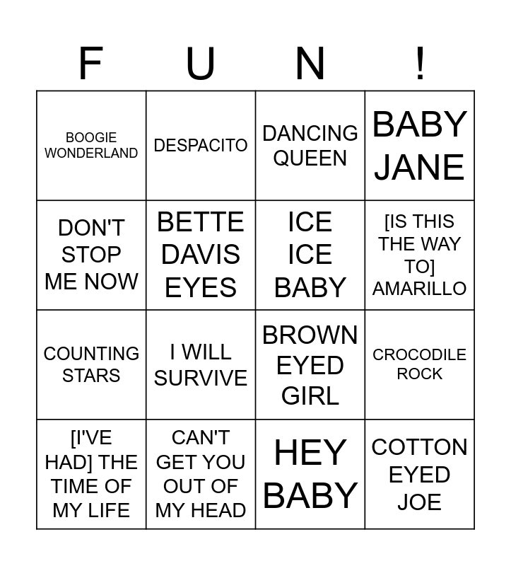 This bingo card has 45 words: Free!, [I'VE HAD] THE TIME OF MY LIFE, ALL NIGHT LONG [ALL NIGHT], BABY ONE MORE TIME, CAN'T STOP THE FEELING, CELEBRATION, DANCING QUEEN, DECEMBER 63 [OH WHAT A NIGHT], DON'T STOP ME NOW, NEVER FORGET, BABY JANE, CAN'T GET YOU OUT OF MY HEAD, DON'T LEAVE ME THIS WAY, DON'T STOP BELIEVING, MAMBO NO. 5, THE KETCHUP SONG, MACARENA, BROWN EYED GIRL, CRAZY IN LOVE, I WILL SURVIVE, DESPACITO, ROCK AROUND THE CLOCK, BELIEVE, BOOGIE WONDERLAND, CHIQUITITA, HEY BABY, BREAK EVEN, FOREVER, C’EST LA VIE, COTTON EYED JOE, COME ON EILEEN, DON'T YOU [FORGET ABOUT ME], FLASHDANCE [WHAT A FEELING], FREE, ALL THAT SHE WANTS, CROCODILE ROCK, BARBIE GIRL, DON'T CHA, FEELS LIKE I'M IN LOVE, [IS THIS THE WAY TO] AMARILLO, BETTE DAVIS EYES, COUNTING STARS, I GOT YOU [I FEEL GOOD], ICE ICE BABY and CHAIN REACTION.