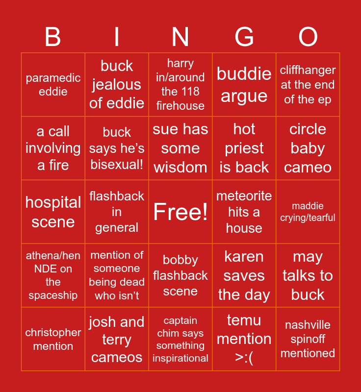 This bingo card has a free space and 24 words: mention of someone being dead who isn’t, josh and terry cameos, sue has some wisdom, christopher mention, cliffhanger at the end of the ep, paramedic eddie, a call involving a fire, buck jealous of eddie, meteorite hits a house, bobby flashback scene, hot priest is back, hospital scene, karen saves the day, may talks to buck, buck says he’s bisexual!, temu mention >:(, maddie crying/tearful, harry in/around the 118 firehouse, circle baby cameo, flashback in general, nashville spinoff mentioned, athena/hen NDE on the spaceship, buddie argue and captain chim says something inspirational.