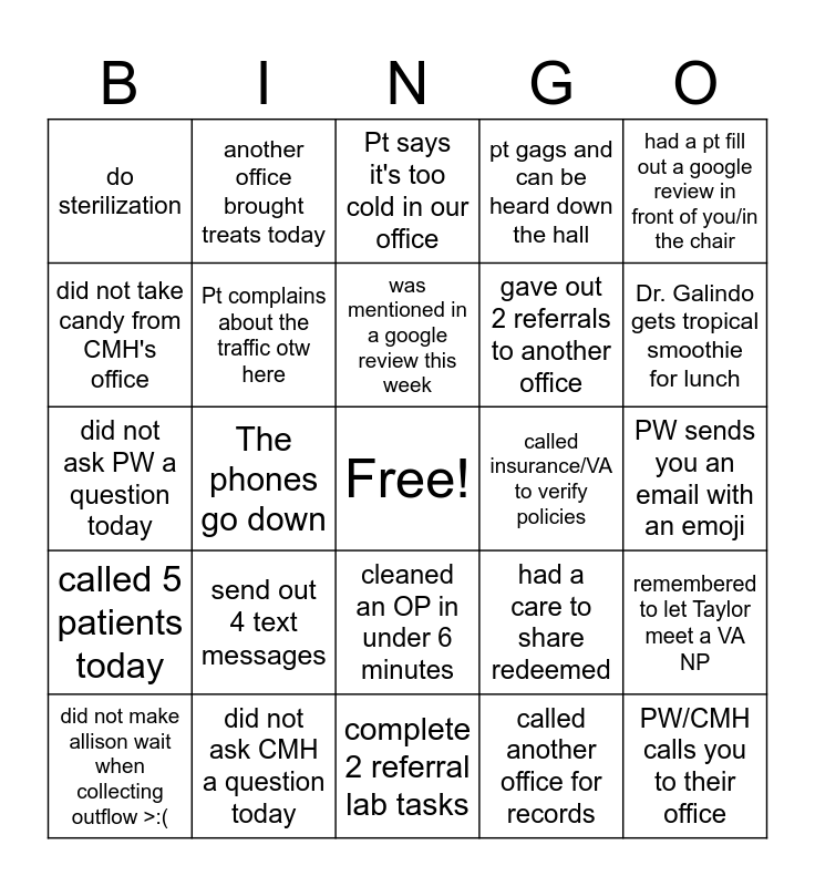 This bingo card has a free space and 24 words: send out 4 text messages, did not ask CMH a question today, was mentioned in a google review this week, did not make allison wait when collecting outflow >:(, had a pt fill out a google review in front of you/in the chair, do sterilization, did not take candy from CMH's office, another office brought treats today, called insurance/VA to verify policies, cleaned an OP in under 6 minutes, gave out 2 referrals to another office, did not ask PW a question today, had a care to share redeemed, remembered to let Taylor meet a VA NP, Pt complains about the traffic otw here, called another office for records, PW sends you an email with an emoji, Pt says it's too cold in our office, Dr. Galindo gets tropical smoothie for lunch, The phones go down, PW/CMH calls you to their office, called 5 patients today, pt gags and can be heard down the hall and complete 2 referral lab tasks.
