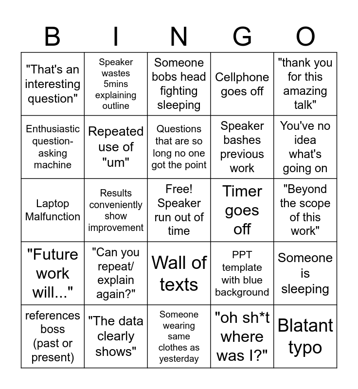 This bingo card has a free space and 24 words: references boss (past or present), "Can you repeat/ explain again?", Questions that are so long no one got the point, "oh sh*t where was I?", "thank you for this amazing talk", "That's an interesting question", Speaker wastes 5mins explaining outline, Someone bobs head fighting sleeping, Timer goes off, "Beyond the scope of this work", Laptop Malfunction, Repeated use of "um", PPT template with blue background, Someone is sleeping, Enthusiastic question- asking machine, "The data clearly shows", Someone wearing same clothes as yesterday, Cellphone goes off, You've no idea what's going on, "Future work will...", Results conveniently show improvement, Wall of texts, Speaker bashes previous work and Blatant typo.