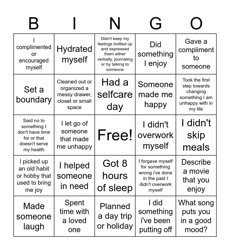 This bingo card has a free space and 24 words: I helped someone in need, Spent time with a loved one, Had a selfcare day, Made someone laugh, Gave a compliment to someone, I complimented or encouraged myself, Set a boundary, Hydrated myself, I didn't overwork myself, Got 8 hours of sleep, Someone made me happy, Said no to something I don't have time for or that doesn't serve my health, I forgave myself for something wrong i've done in the past I didn't overwork myself, Describe a movie that you enjoy, Cleaned out or organized a messy drawer, closet or small space, I did something i've been putting off, I didn't skip meals, Didn't keep my feelings bottled up and expressed them either verbally, journaling or by talking to someone, Took the first step towards changing something I am unhappy with in my life, I let go of someone that made me unhappy, What song puts you in a good mood?, I picked up an old habit or hobby that used to bring me joy, Did something I enjoy and Planned a day trip or holiday.